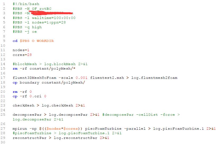 超算使用PBS任务提交系统。日常通过putty登录到超算的“登录节点”,后“ssh nodeXXX”连接到超算的“计算节点”。我在ssh后的节点上然后通过alias方式编译了OpenFOAM的20x、240和foam-extend4.0,编译时用的编译器是系统自带编译器,mpi则是对应ThirdParty中的openmpi。编译过程无错误。
