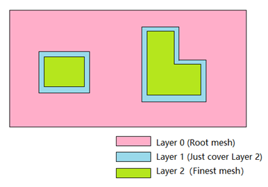 该程序采用C++语言编写,流场计算使用有限差分法,五阶WENO格式,Steger-Warming通量分裂,2D欧拉方程,时间推进采用3阶Runge-Kutta方法;网格自适应加密方法和加密准则与您的论文有所不同,采用基于原始根网格进行加密,每个网格单元生成3×3个子网格单元,加密准则使用密度梯度(∂ρ⁄(∂x+∂ρ⁄∂y))。一共使用三层网格,在计算域[0,3]×[0,1]中,原始根网格单元数量为300×100。Layer 0表示原始根网格,Layer 2表示最密的网格。Layer 2比Layer 1略大,覆盖Layer 1,两层网格的间隙为3个根网格单元的尺度,如图2所示。以此希望精准捕捉激波,并适当减少网格生成数量。子网格层的时间步长为父网格层的1/3。