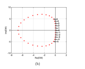 带摩擦的运输方程是 u_t = lambda * u_x = eps * u_xx, 通过变化, 我们得到了, ,其中D是导数矩阵, D2 是二阶导数矩阵 然后, 我们对M进行求特征值(EW), 得到了这种图片, 我想知道这是为什么呢?