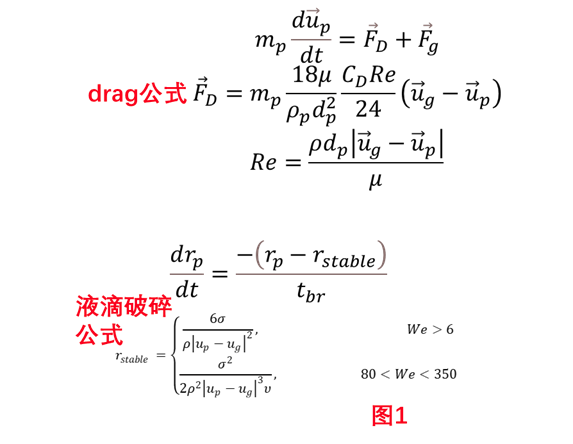 - 破碎模型用的是ReitzDiwakar model,具体公式如图中所示,计算得到100%和200%air中的rstable分别为18μm和1.2μm,也就是说后者的液滴粒径更小。这里您说的破碎模型如何处理质量是什么意思呢?是指公式中的密度么?