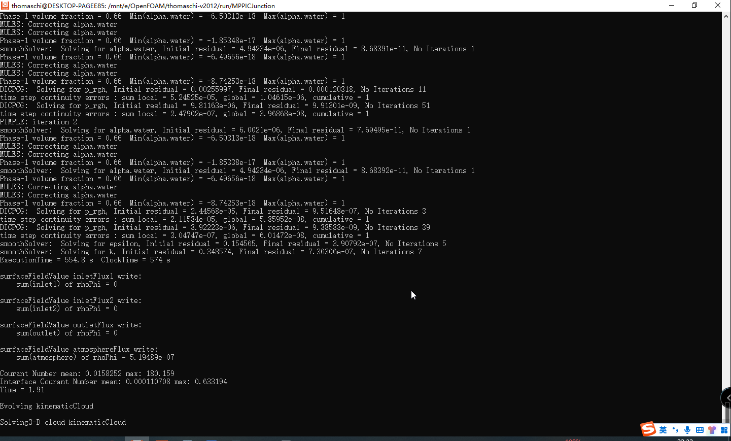 我想用MPPICInterFoam做泥沙冲淤,水槽底部需要铺5厘米左右的沙子,我就先在静水中加入颗粒,让颗粒在重力下自然沉降,但是算的过程中会经常出现算到某一步时间步库朗数和颗粒动量都突然增大,然后计算就卡住不再进行了,有时候关掉从上一个存储文件接着算还能再算下去,但是时不时就出现这种卡住的情况是什么原因呢?该怎么解决呢?