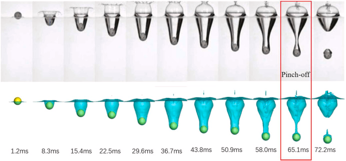 入水后小球位移模拟值与试验值对比良好。使用paraview-counter设置alpha.water=0.5提取液面,发现气液界面附近的空腔结构与试验照片对比较好,但是小球周围并没有出现空腔结构。
