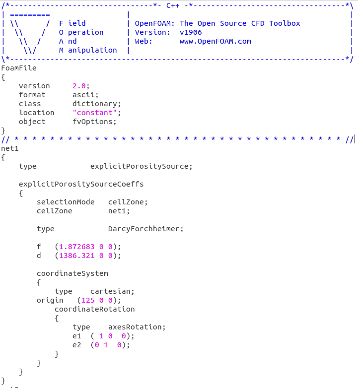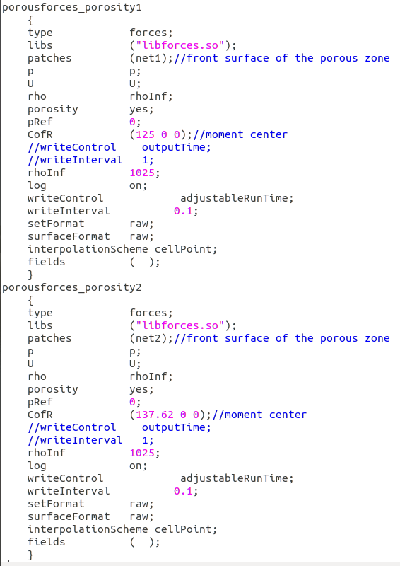 关于分别监测两块多孔介质区域受力的问题各位老师好,最近在算波浪和两块多孔介质区域作用的算例,多孔介质区域我使用fvoption这个文件定义的,定义文件如下:
