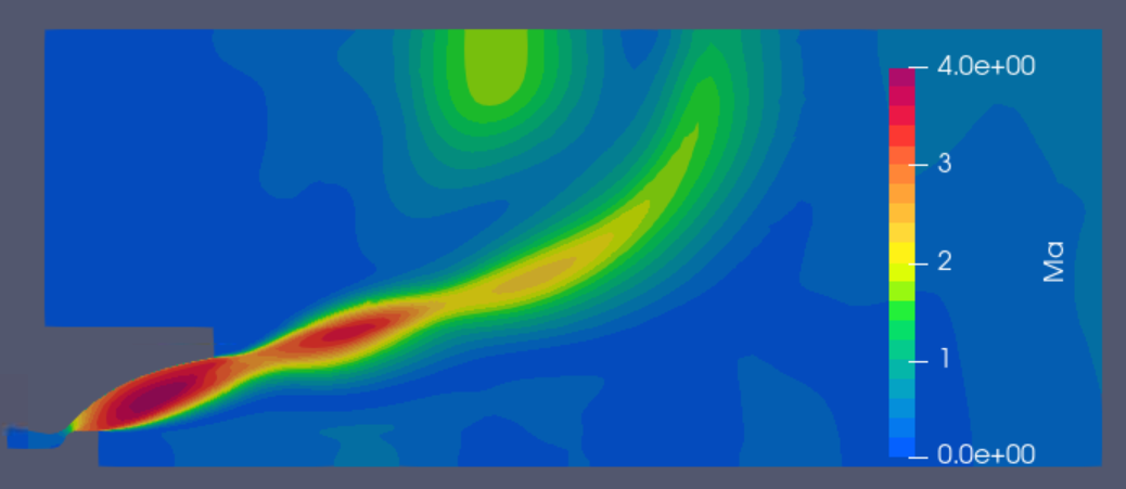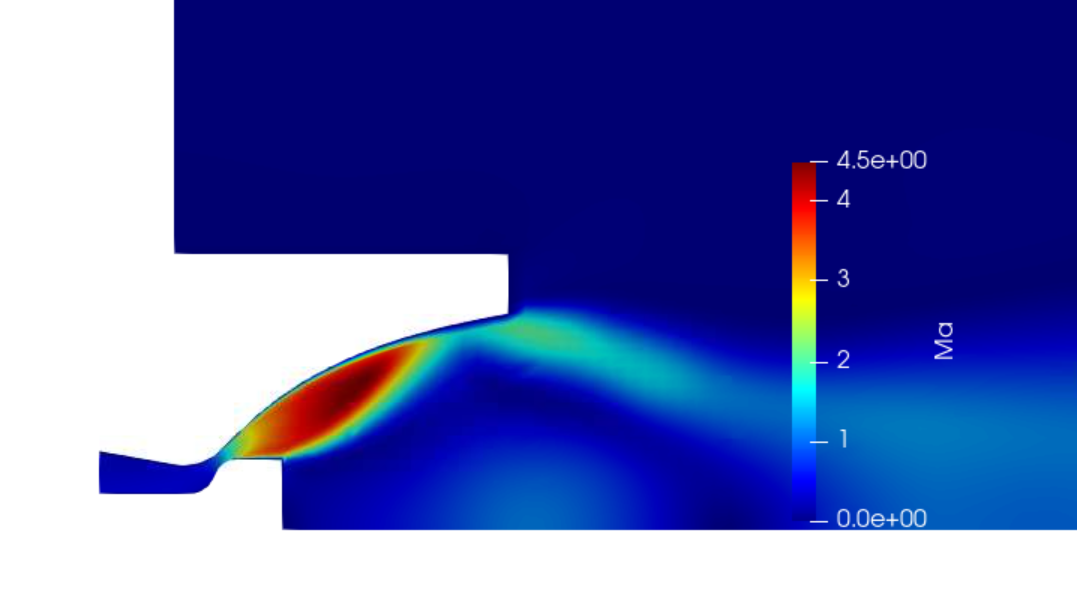一个二维膨胀偏流喷管的算例。我先画了一个粗网格,喷管内流动算的还可以,但外部流动发散了,并且和其他Fluent计算的偏差很大。求助各位大佬,出口的边界条件应该怎么设置呢?